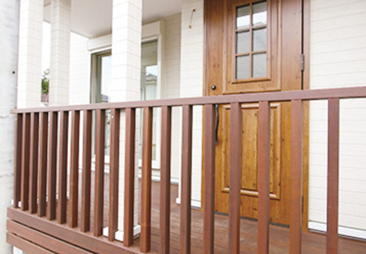 イタウバウッドデッキとバイナルフェンスの輸入住宅の玄関ポーチが完成