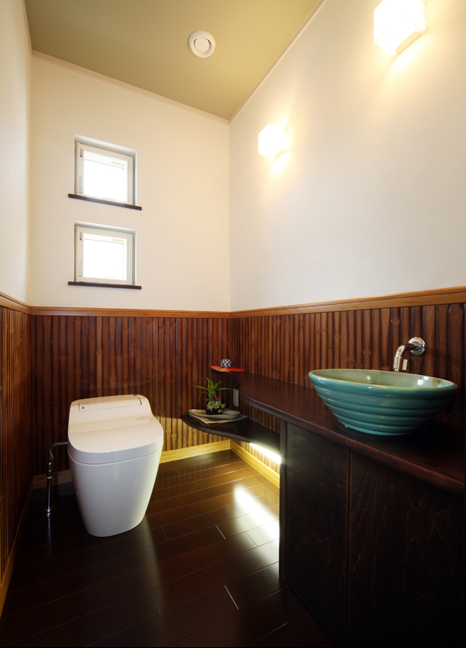 砂壁と竹の腰板のトイレ 和紙張りの照明も和モダンの演出だ イエタテ