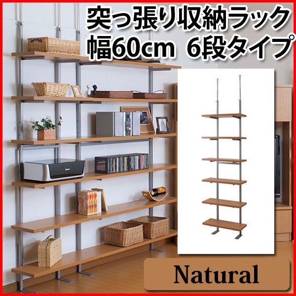 壁面ラック つっぱり 幅60cm 6段 ナチュラル 収納棚 天井突っ張り式